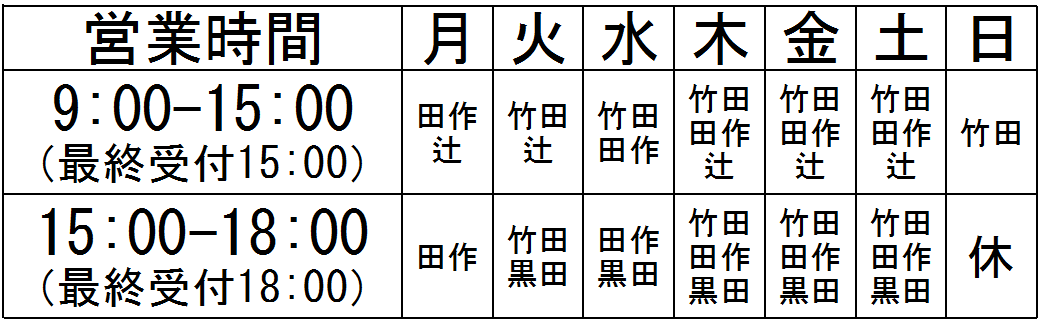 | 営業時間 | 9:00〜15:00(最終受付/15:00)、15:00〜18:00(最終受付/18:00) |
